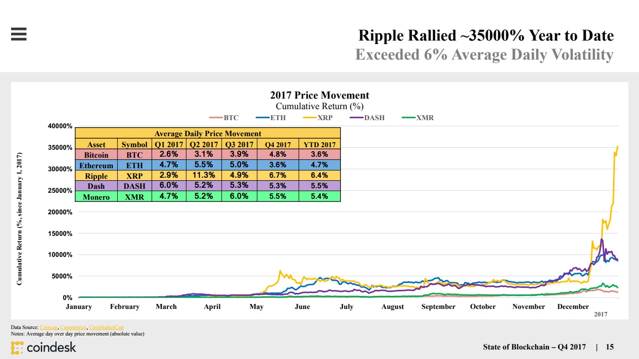 Bitcoin took most of the spotlight last year, with Ethereum and Ripple trailing behind. But the largest cumulative return was achieved by Ripple; followed by Dash, Monero, Ethereum, and finally Bitcoin.