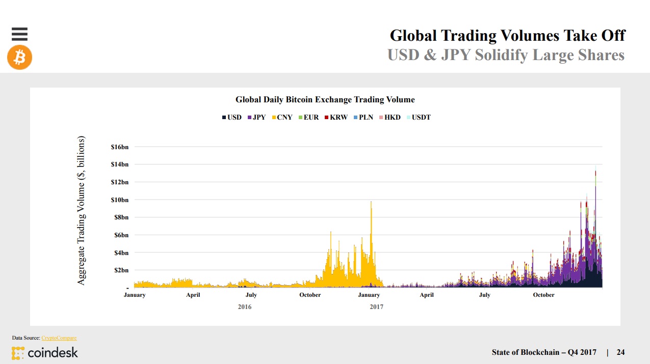 The chart below reveals trading volume in Bitcoin from 2016 to the end of 2017, highlighting only the largest international participants.
