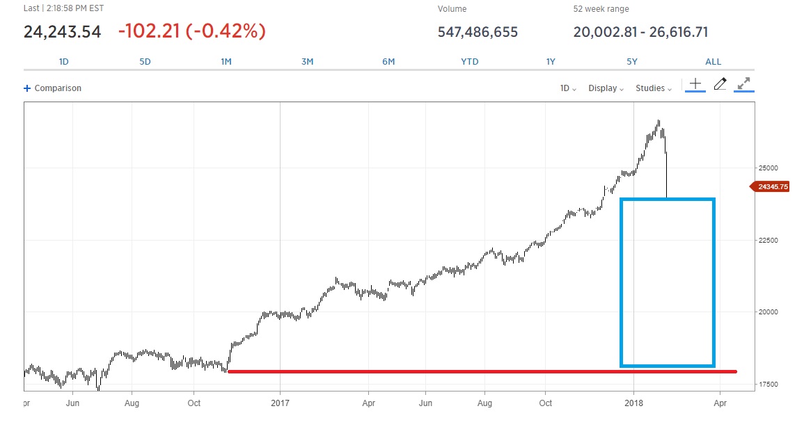 January 26 marked the Dow’s high at 26,616.71, a level from which it had declines by approximately 2,300 points through Monday’s close of 24,345.75.