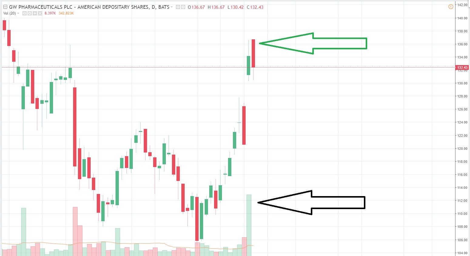 GW Pharmaceuticals PLC  shares surged 10.3% in heavy Tuesday morning trade after the release of positive briefing documents for a Food and Drug Administration advisory committee meeting regarding the company’s cannabis-derived drug epidiolex.