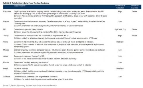 Goldman Sachs produced an interesting study identifying the nations that are most likely to retaliate and estimating the severity of their response: