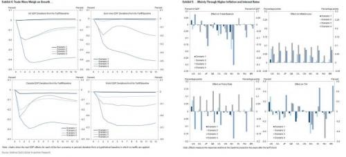 - “A severe trade war—in which everyone imposes a tariff on everyone else—leads to higher world inflation, tighter monetary policy and slower growth.”