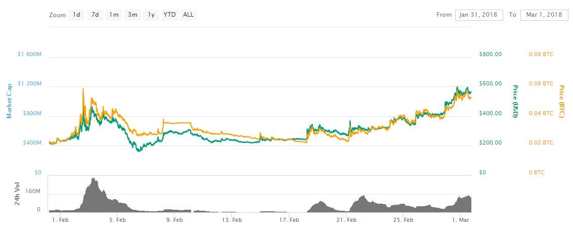 DigixDao (DGD), an ethereum-based token, gained a staggering 136 percent last month, rising 90 percent in the last week alone to hit an all-time high of $597.66 Wednesday, according to CoinMarketCap.