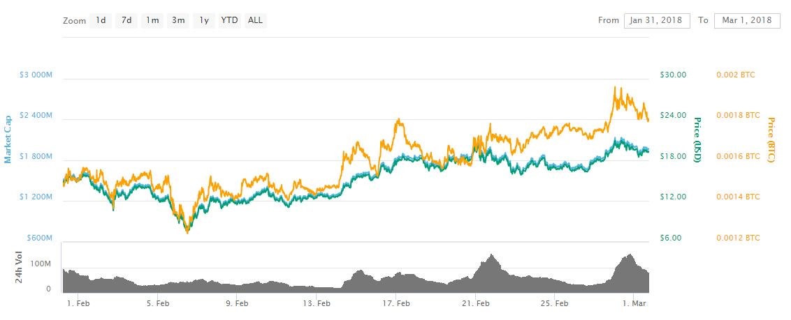 Having rallied more than 140 percent from the Feb. 6 low of $7.39, OmiseGo’s ICO token ranks third on the list of gainers among top 25 cryptocurrencies by market capitalization. The project signed a deal with the Thailand government last month develop a payment system, as well as an identification system.