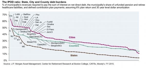 You can see that Chicago is in the worst position, as 60% of its revenues via tax dollars go toward funding debt and pensions.