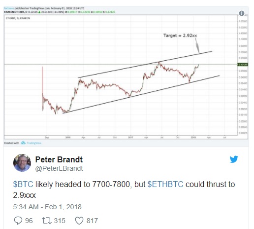 Brandt, who continuously called out bitcoin’s $7,700 dip since January 22, stated that based on classical charting, bitcoin would likely experience another dip before a recovery.