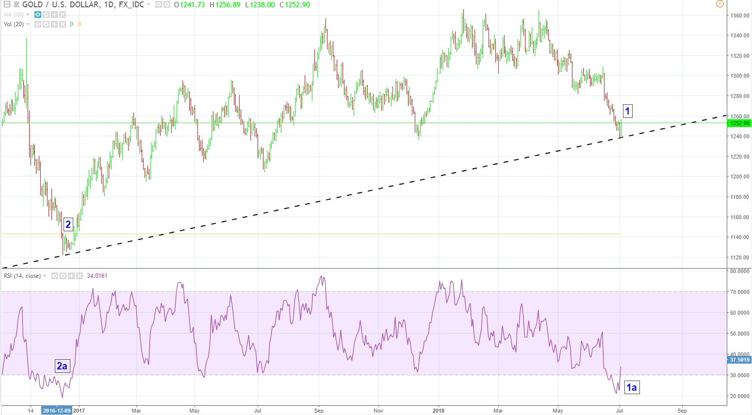 Today, gold just bounced off its long-term trend line (1). The Relative Strength Index (RSI), an indicator used to gauge overbought and oversold levels, is giving us an extreme oversold level at (1a). You can see similar activity during the December 2016 gold correction (2) wherein the RSI reading reached an equivalent oversold reading at (2a).