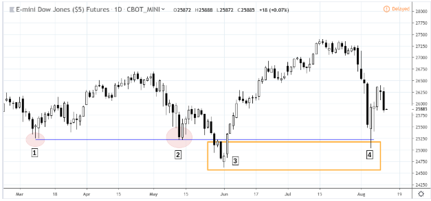 It helps to anticipate likely support by zooming out to a larger time frame, and judging from the strong reversal on August 6, many of the more technical traders had anticipated this general level based on the previous support levels going back to March of this year.